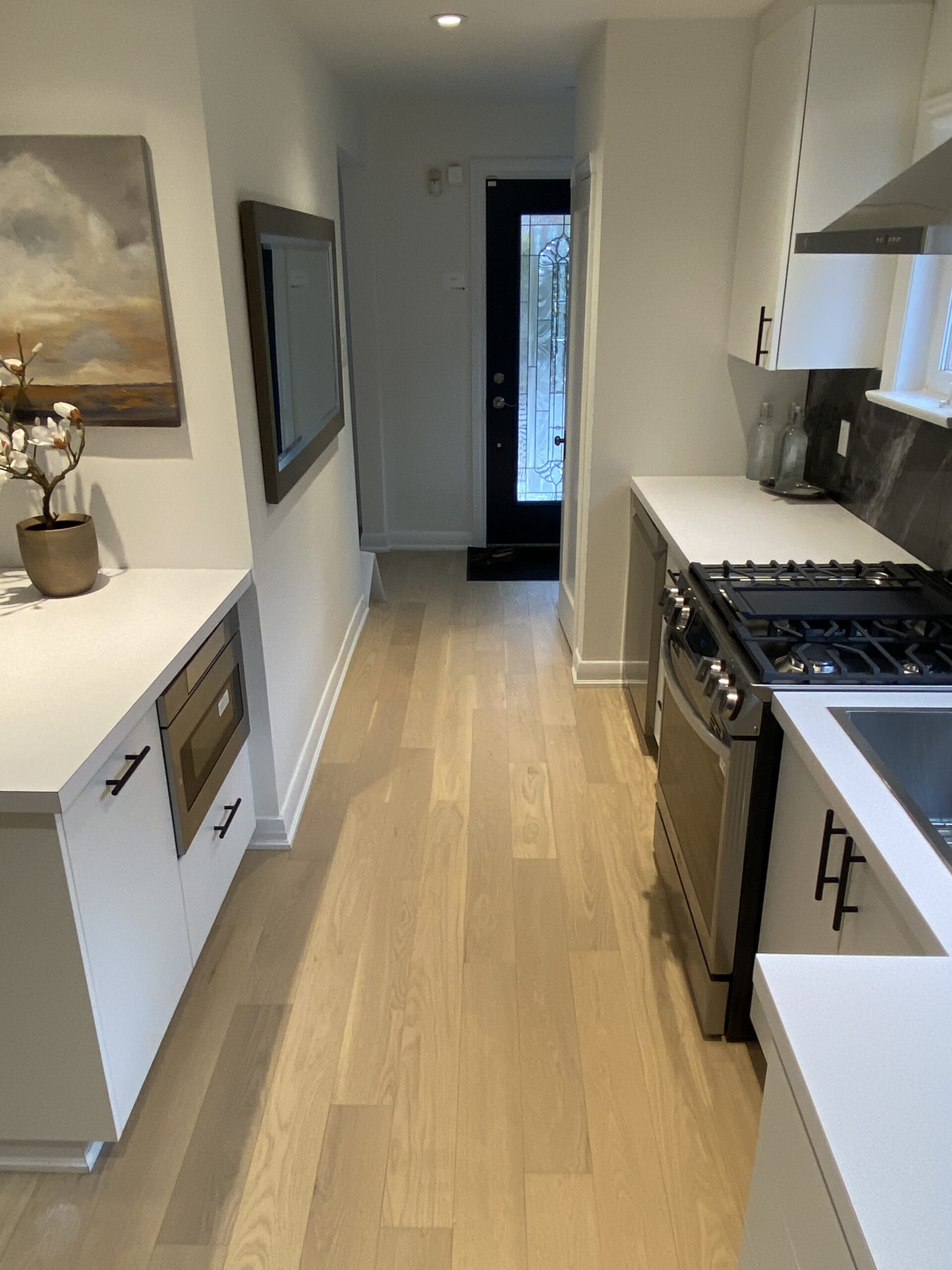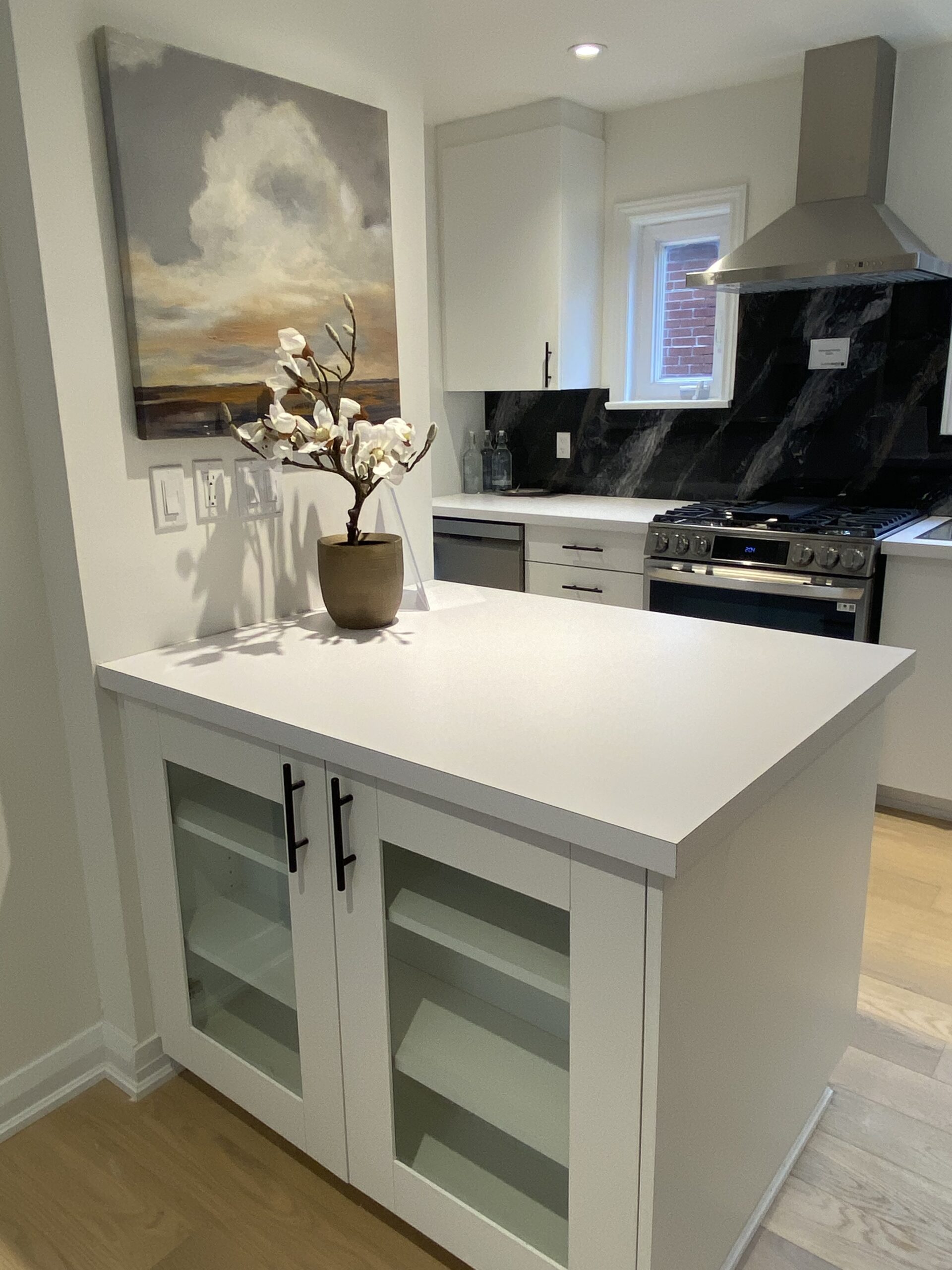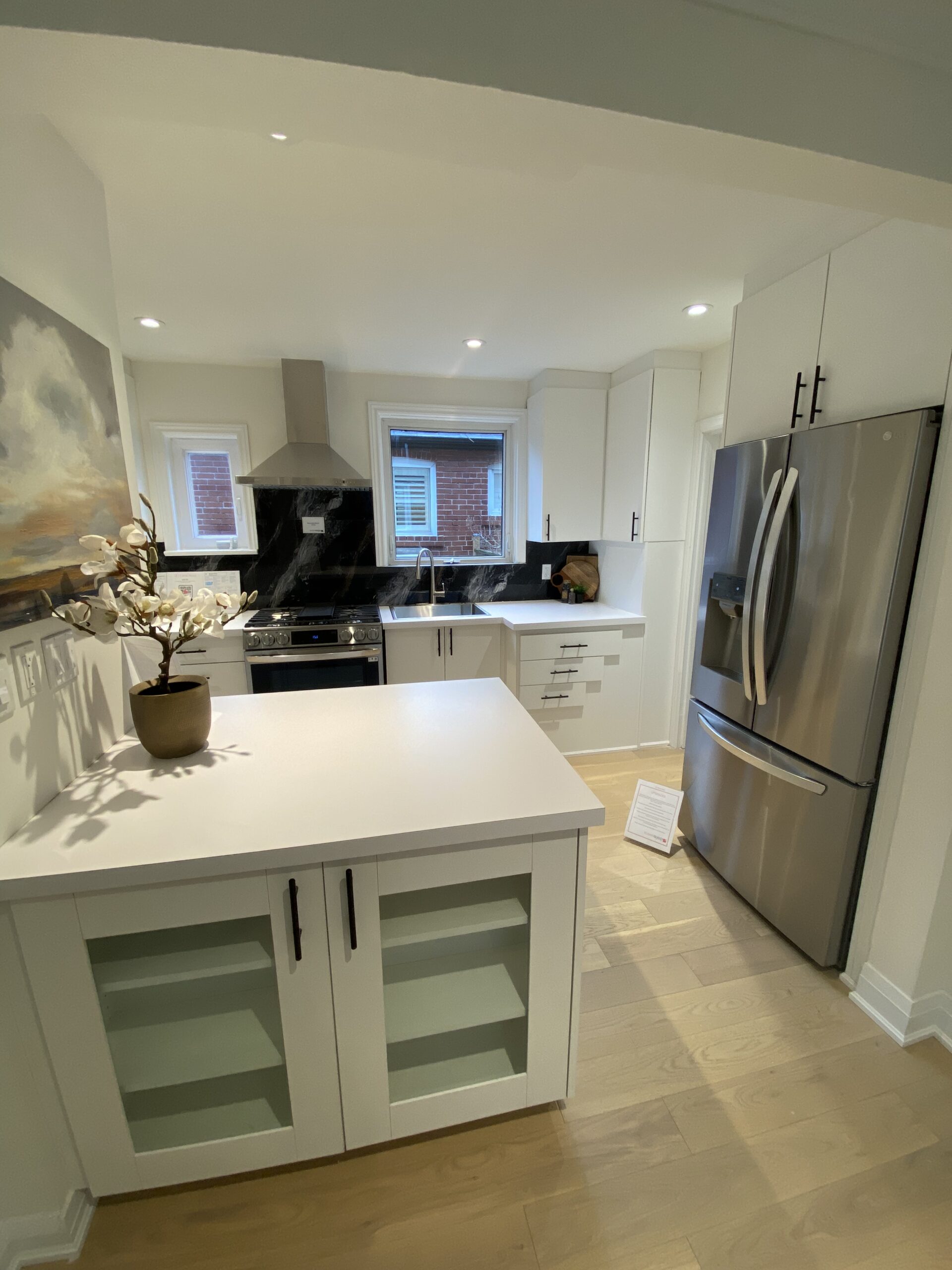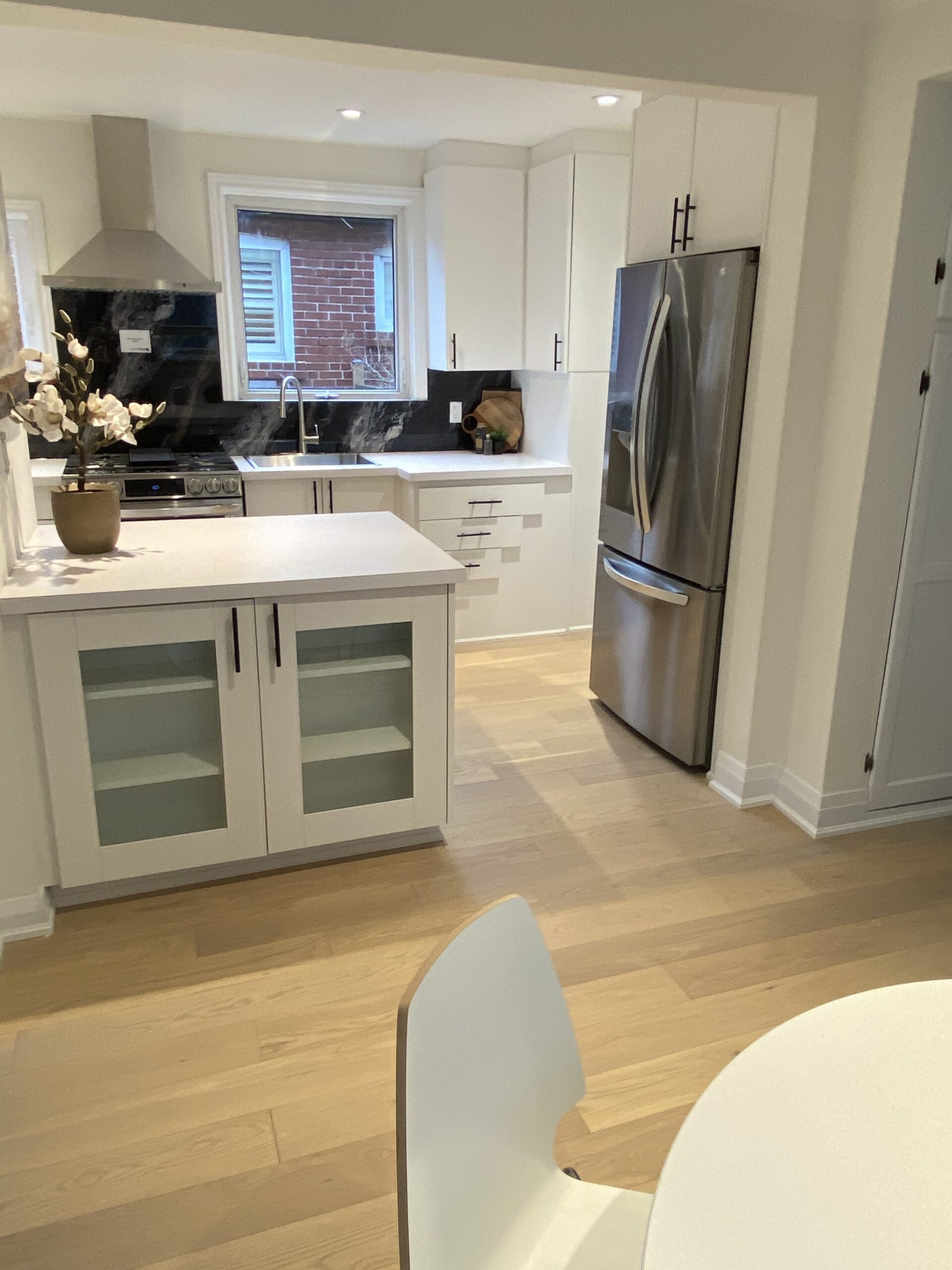 The "after" photos showcase a complete metamorphosis. The space has been opened up, dramatically improving flow and light. The architectural planning strategically relocated appliances, introduced sleek white cabinetry, and integrated a stylish new island with glass-front storage, offering both expanded prep space and a central gathering point. Elegant black marble backsplashes provide a striking contrast to the clean white countertops and light hardwood flooring, elevating the room's aesthetic. Recessed lighting enhances the bright, airy feel, while the new stainless steel appliances and contemporary fixtures complete this truly remarkable kitchen redesign, demonstrating EXEURBAN's ability to maximize both form and function.