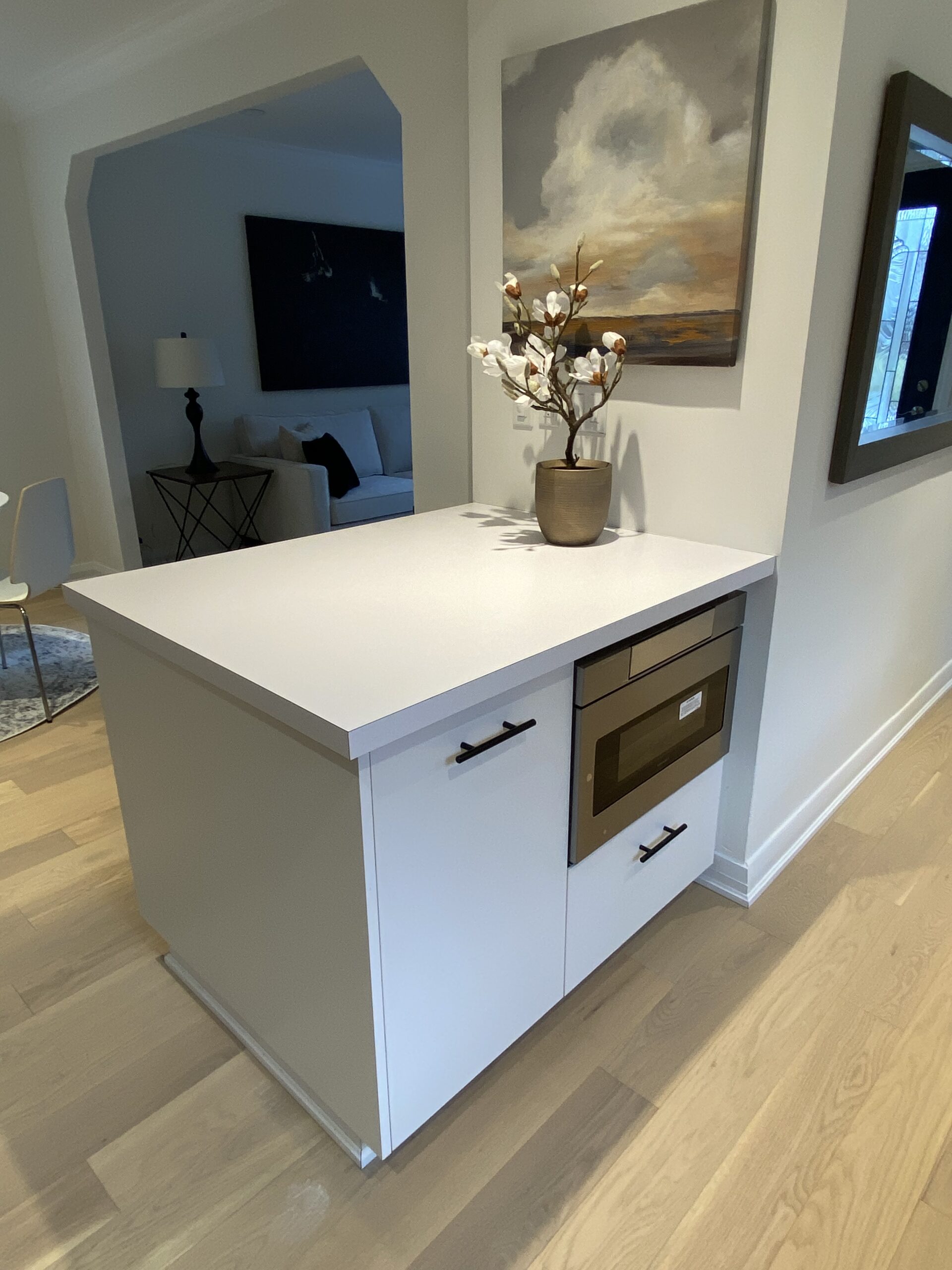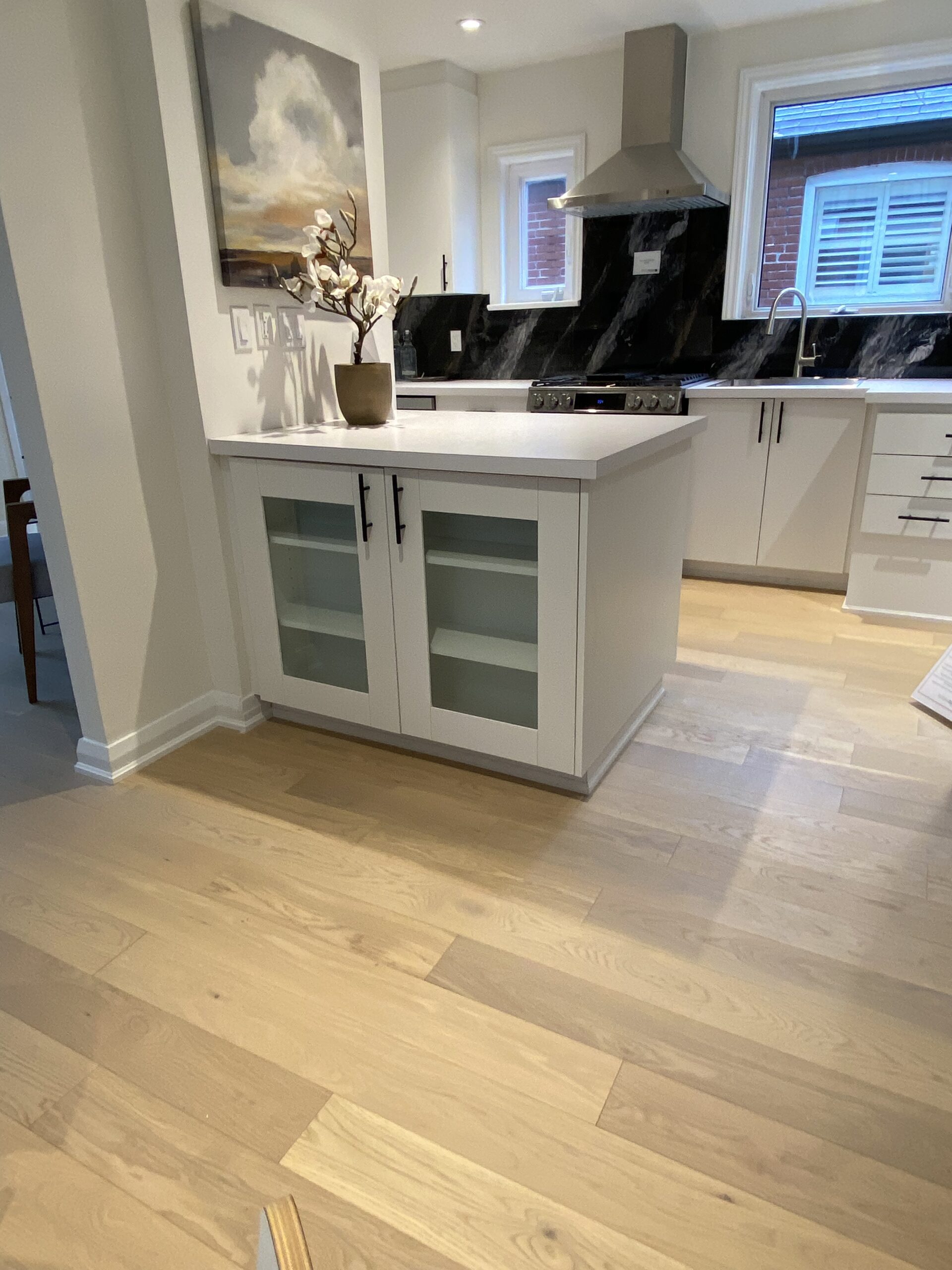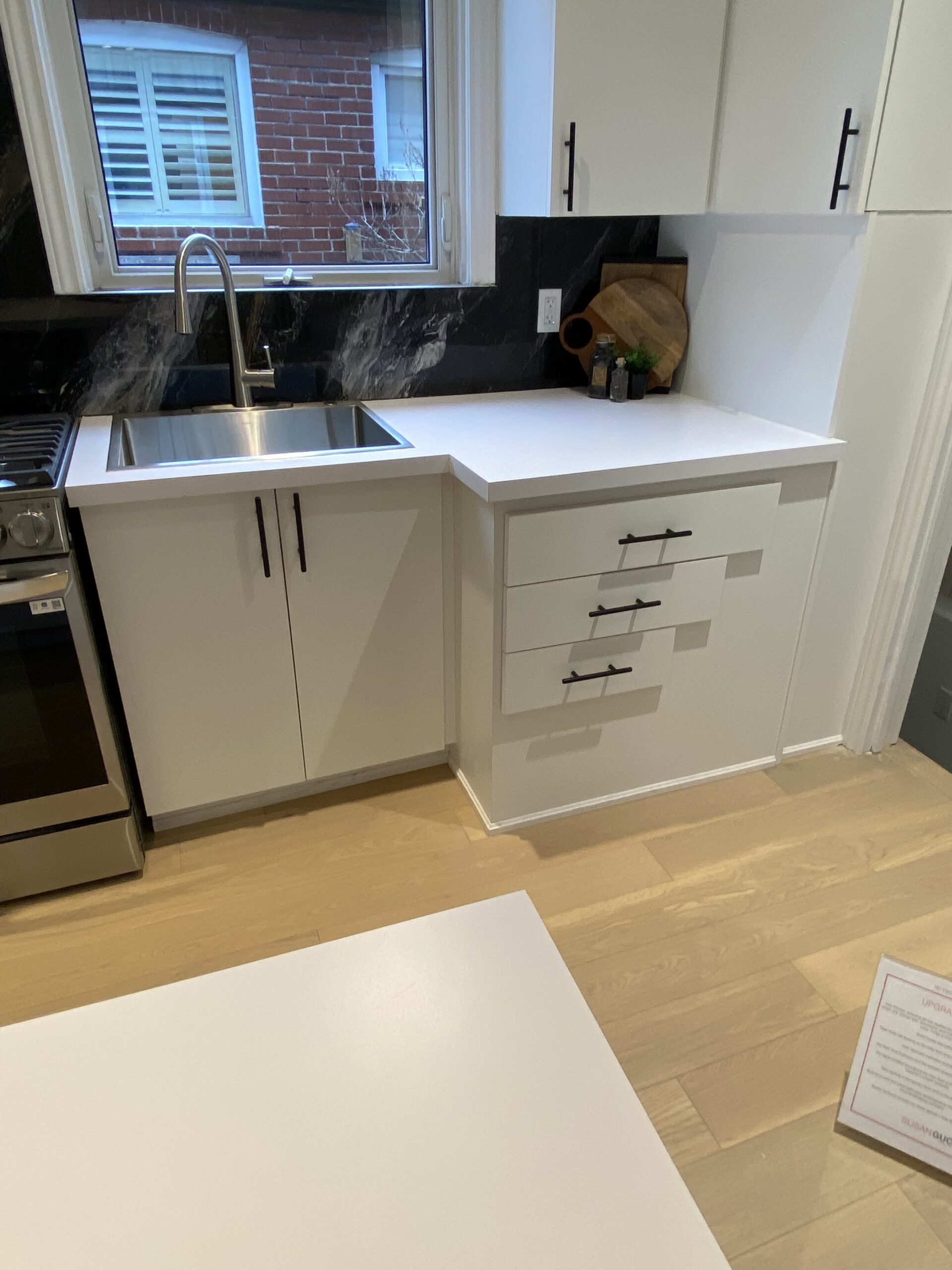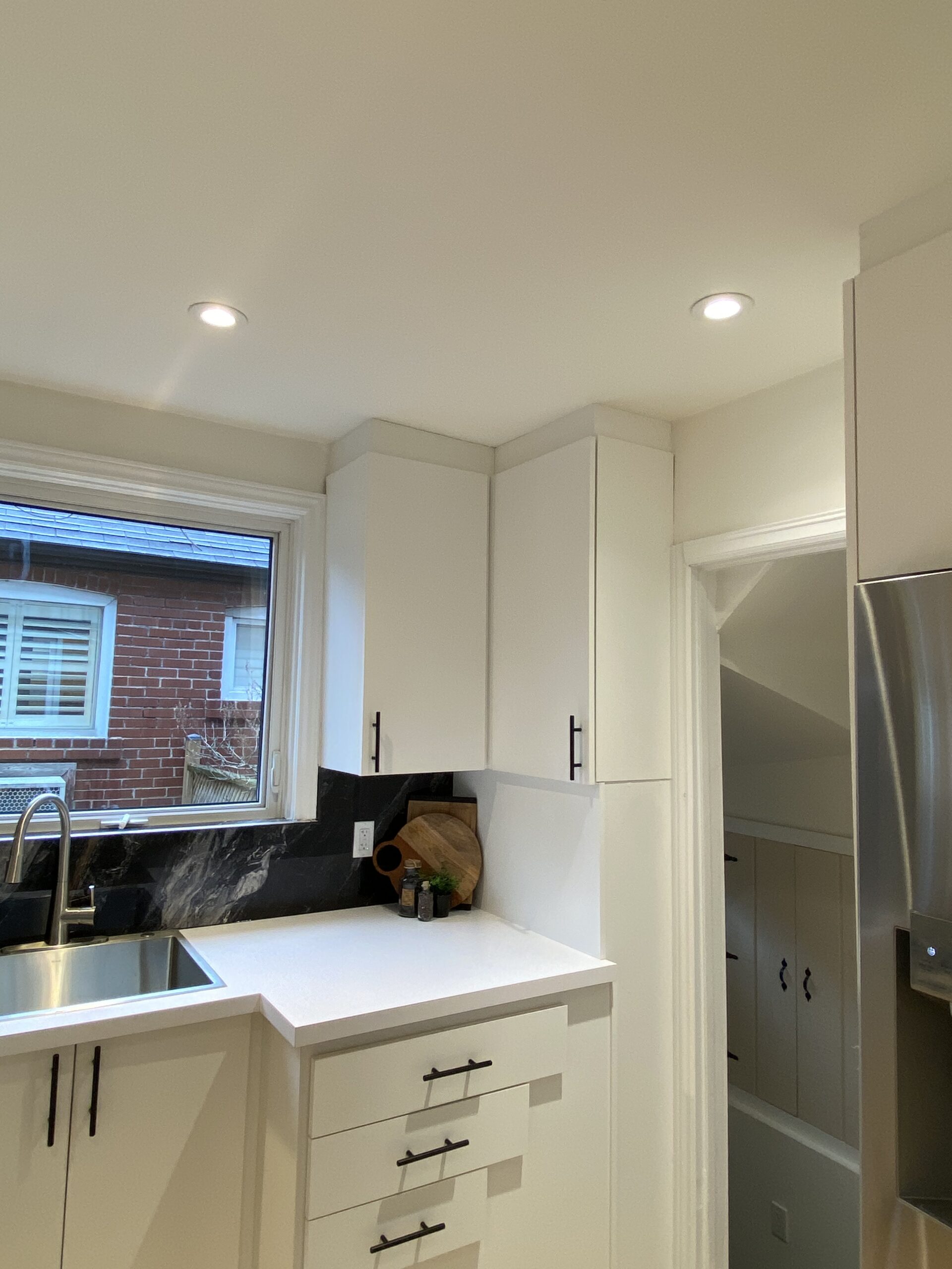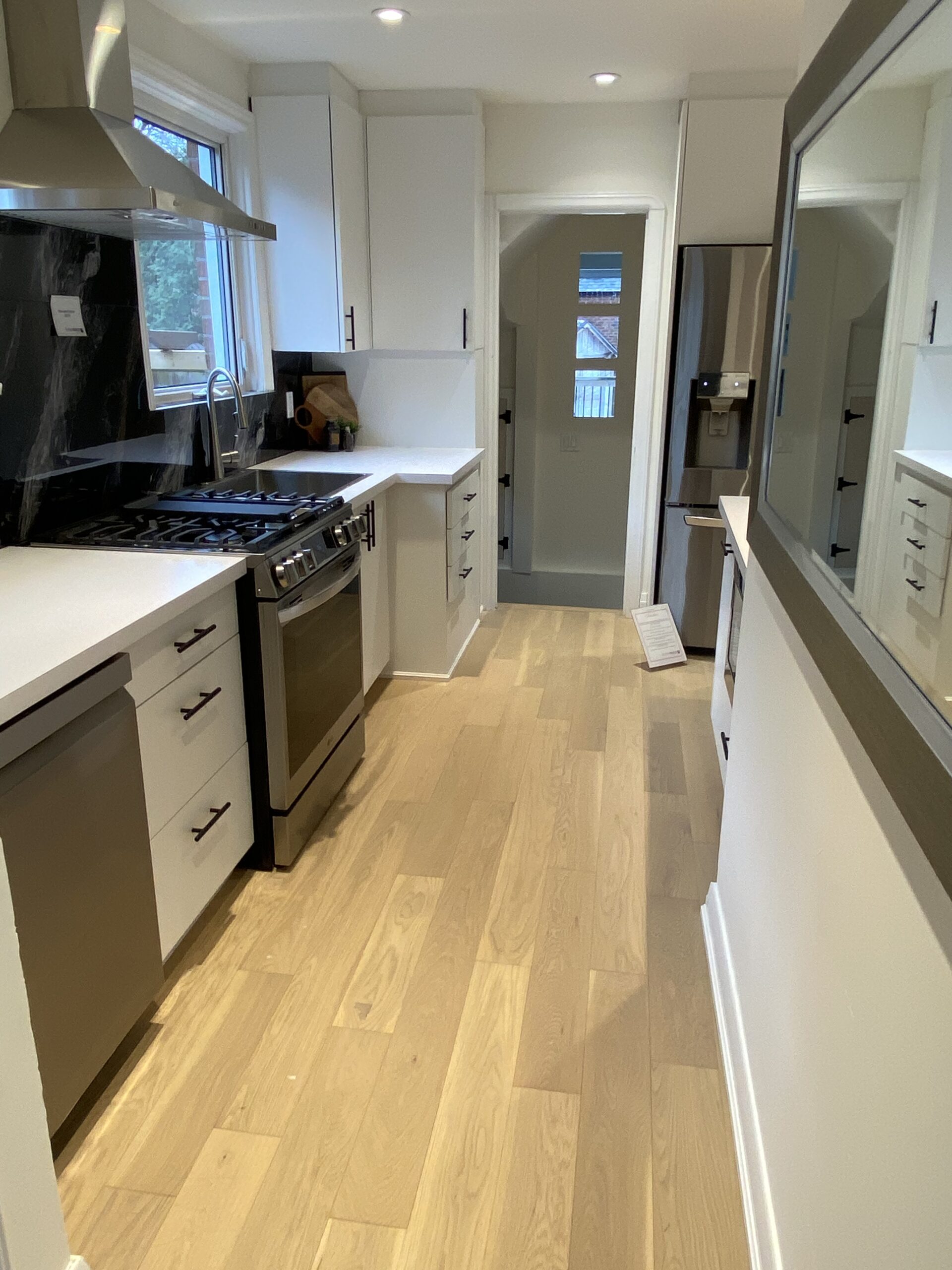 The "after" photos showcase a complete metamorphosis. The space has been opened up, dramatically improving flow and light. The architectural planning strategically relocated appliances, introduced sleek white cabinetry, and integrated a stylish new island with glass-front storage, offering both expanded prep space and a central gathering point. Elegant black marble backsplashes provide a striking contrast to the clean white countertops and light hardwood flooring, elevating the room's aesthetic. Recessed lighting enhances the bright, airy feel, while the new stainless steel appliances and contemporary fixtures complete this truly remarkable kitchen redesign, demonstrating EXEURBAN's ability to maximize both form and function.