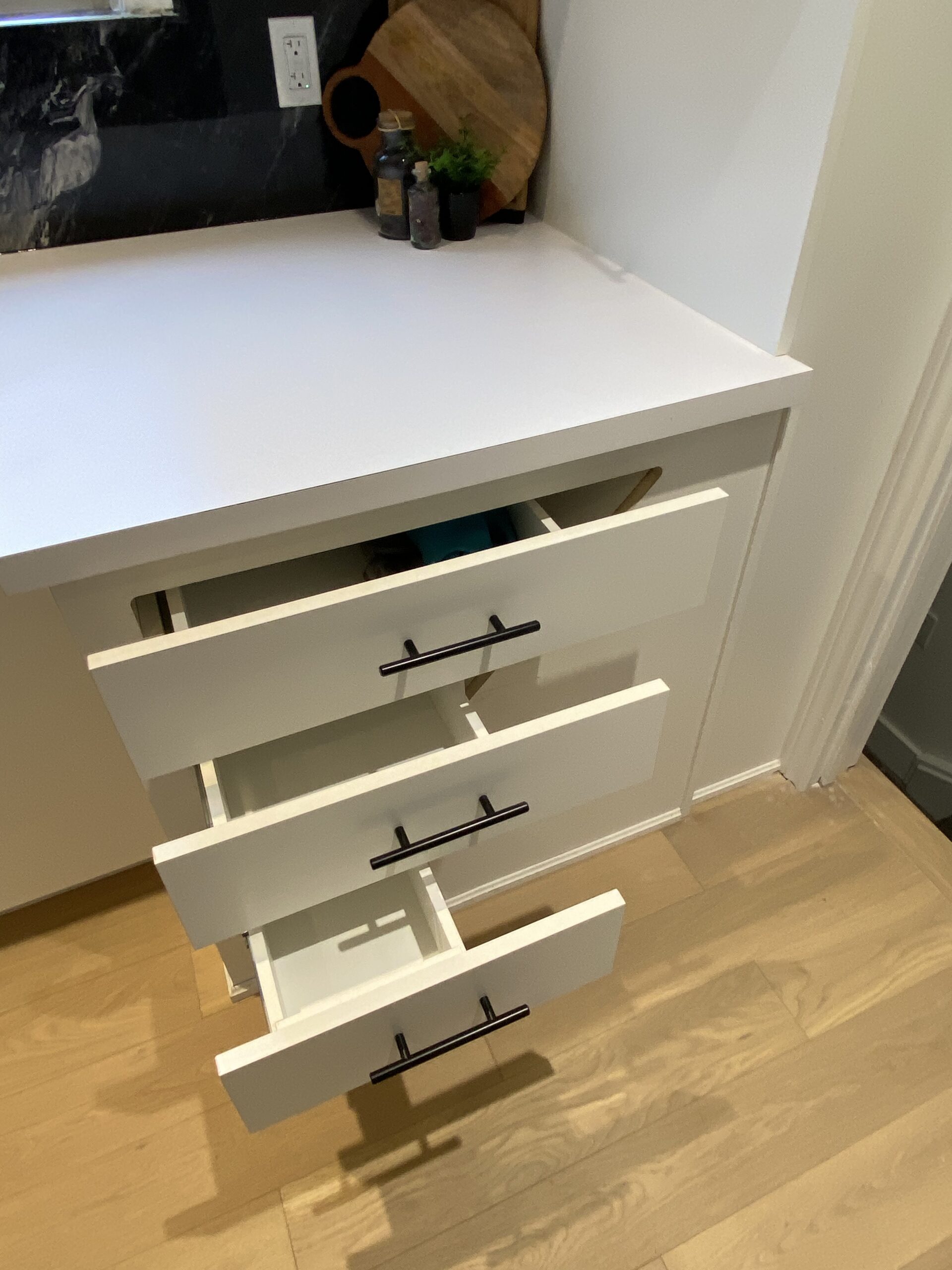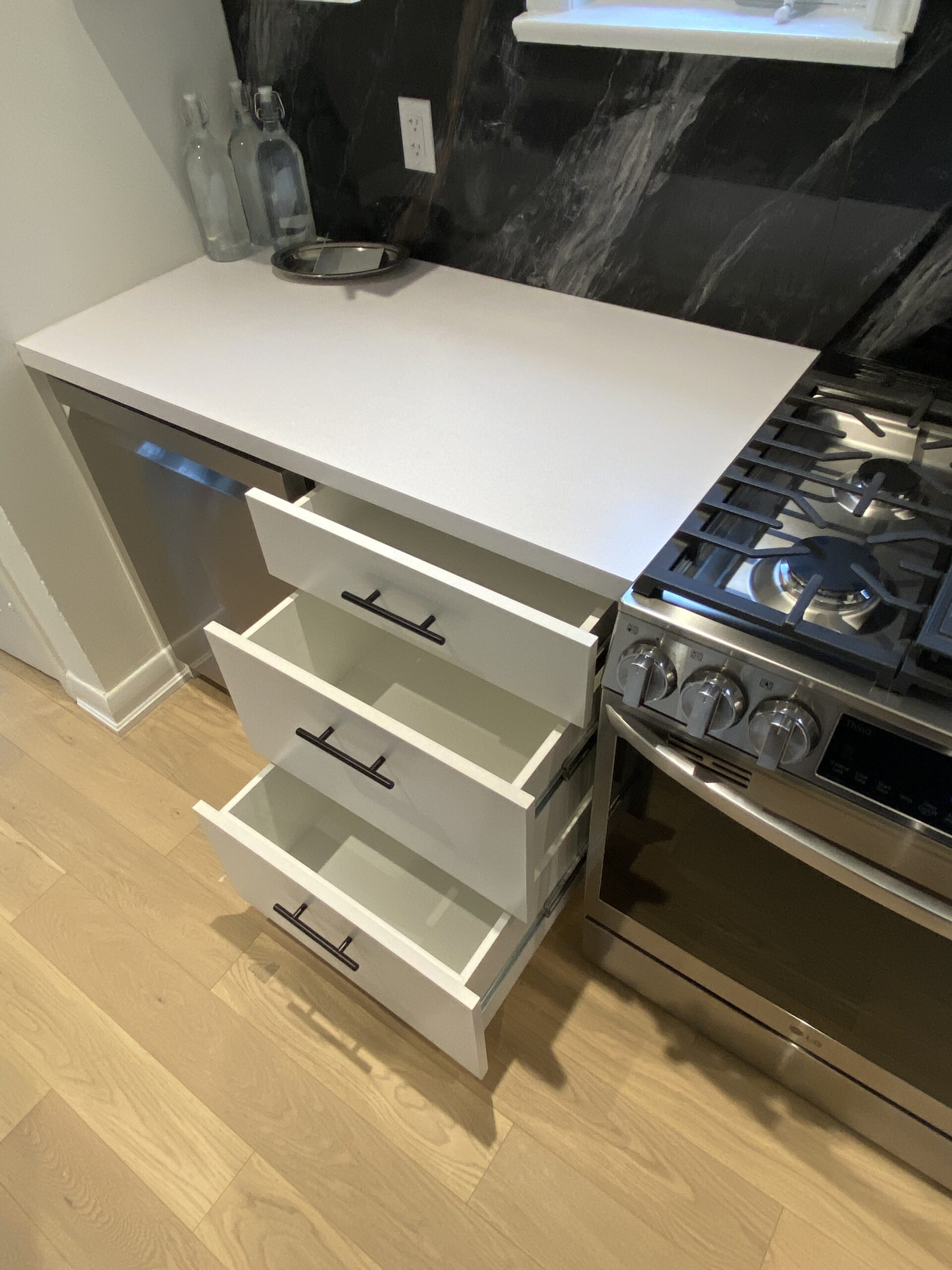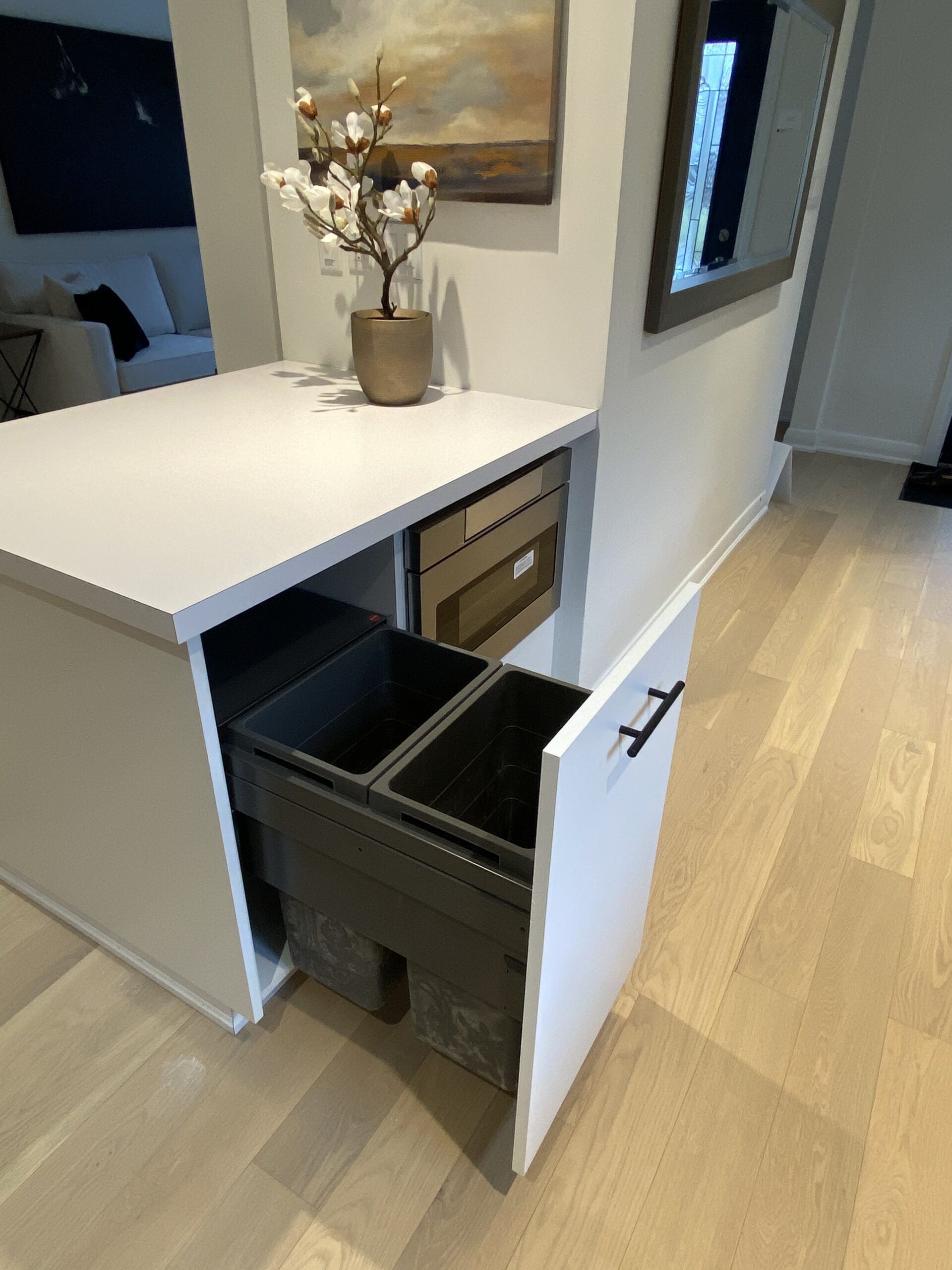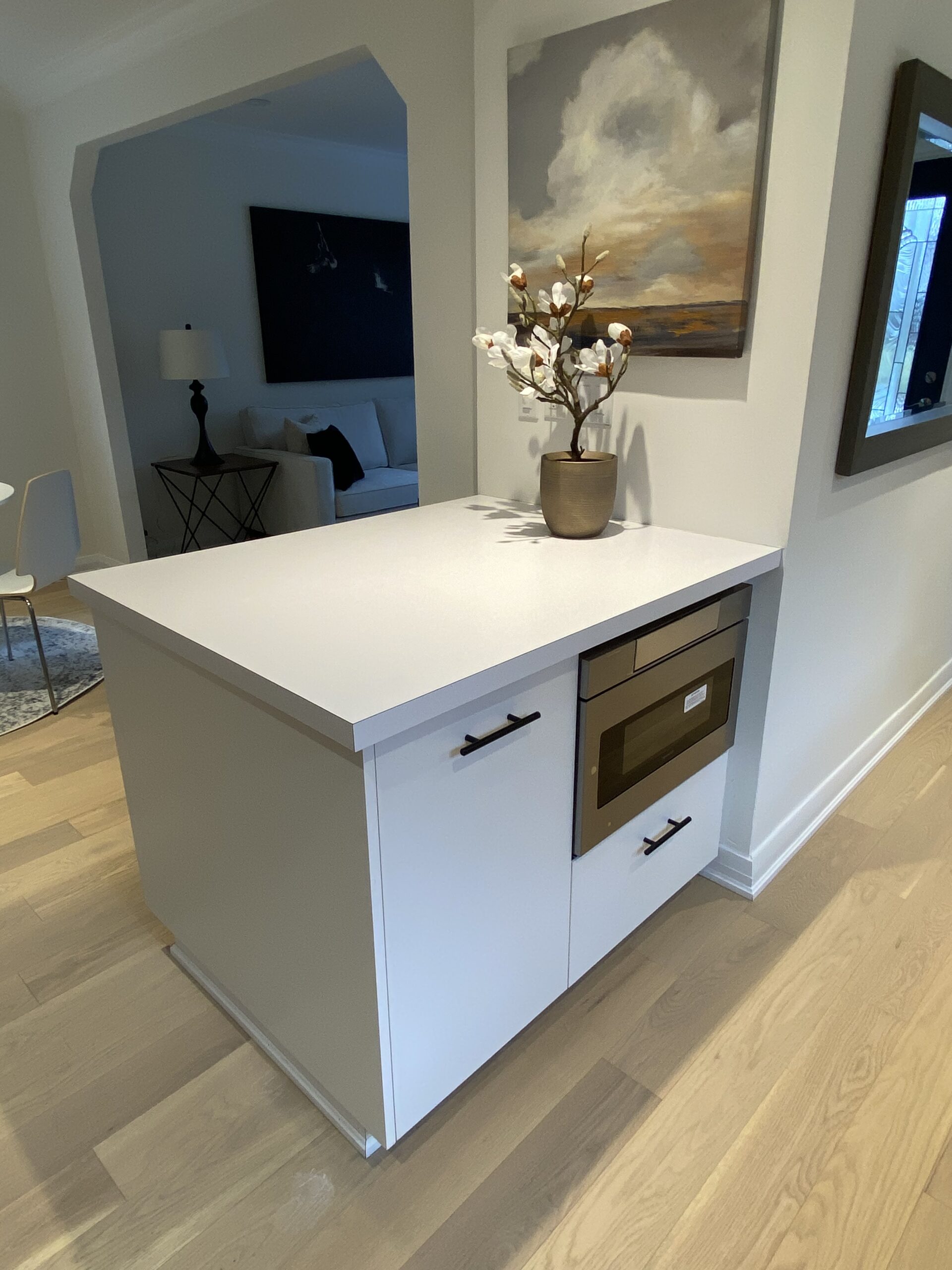The "after" photos showcase a complete metamorphosis. The space has been opened up, dramatically improving flow and light. The architectural planning strategically relocated appliances, introduced sleek white cabinetry, and integrated a stylish new island with glass-front storage, offering both expanded prep space and a central gathering point. Elegant black marble backsplashes provide a striking contrast to the clean white countertops and light hardwood flooring, elevating the room's aesthetic. Recessed lighting enhances the bright, airy feel, while the new stainless steel appliances and contemporary fixtures complete this truly remarkable kitchen redesign, demonstrating EXEURBAN's ability to maximize both form and function.